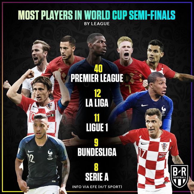 2018 러시아 월드컵 4강전에 출전할 92명의 선수 중 절반에 가까운 40명이 잉글랜드 프리미어리그(EPL)서 활약하고 있는 것으로 드러났다.