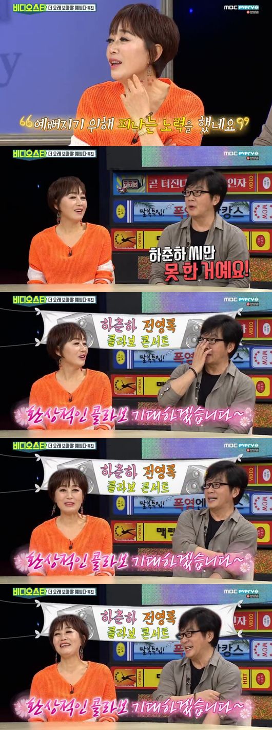 10일 방송된 MBC 에브리원 예능 '비디오스타'에서 2주년 특집으로 전영록, 하춘화, 채리나, 딘딘이 출연했다.