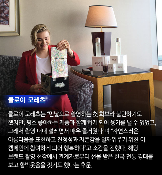 클로이 모레츠는 “민낯으로 촬영하는 첫 화보라 불안하기도 했지만, 평소 좋아하는 제품과 함께 하게 되어 용기를 낼 수 있었고, 그래서 촬영 내내 설레면서 매우 즐거웠다”며 “자연스러운 아름다움을 표현하고 진정성과 자존감을 일깨워주기 위한 이 캠페인에 참여 하게 되어 행복하다”고 소감을 전했다.