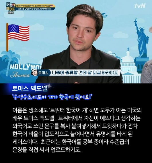이름은 생소해도 ‘트위터 한국어 걔’ 하면 모두가 아는 미국의 배우 토마스 맥도넬. 넷플릭스의 인기 시리즈 100의 주연 배우로 활약한 그는 트위터에서 자신이 예쁘다고 생각하는 외국어로 쓰인 문구를 복사 붙여넣기해서 트윗하다가 점차 한국어 비율이 압도적으로 늘어나면서 유명세를 타게 된 케이스이다.