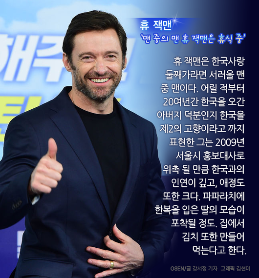 휴 잭맨은 한국사랑 둘째가라면 서러울 맨 중 맨이다. 어릴 적부터 20여년간 한국을 오간 아버지 덕분인지 한국을 제2의 고향이라고 까지 표현한 그는 2009년 서울시 홍보대사로 위촉 될 만큼 한국과의 인연이 깊고, 애정도 또한 크다. 파파라치에 한복을 입은 딸의 모습이 포착될 정도. 집에서 김치 또한 만들어 먹는다고 한다.