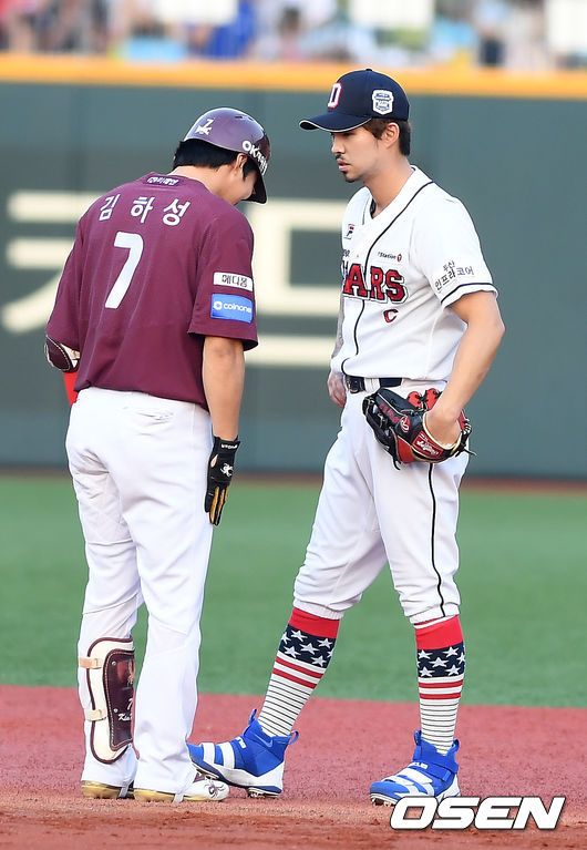 이후 3회초에는 나눔 올스타 김하성(넥센)과 드림 올스타 오재원(두산)이 다시 한 번 웃음 폭탄을 터뜨리게 했다. 김하성은 3회초 선두타자로 등장해 좌월 솔로포를 터뜨렸다. 여기서 김하성이 2루를 돌 때 2루수 오재원이 김하성을 불러세웠고 호통을 치는 듯한 세레머니를 했다. 김하성도 다오항하지 않고 고개를 숙이면서 오재원과 합을 맞췄다.