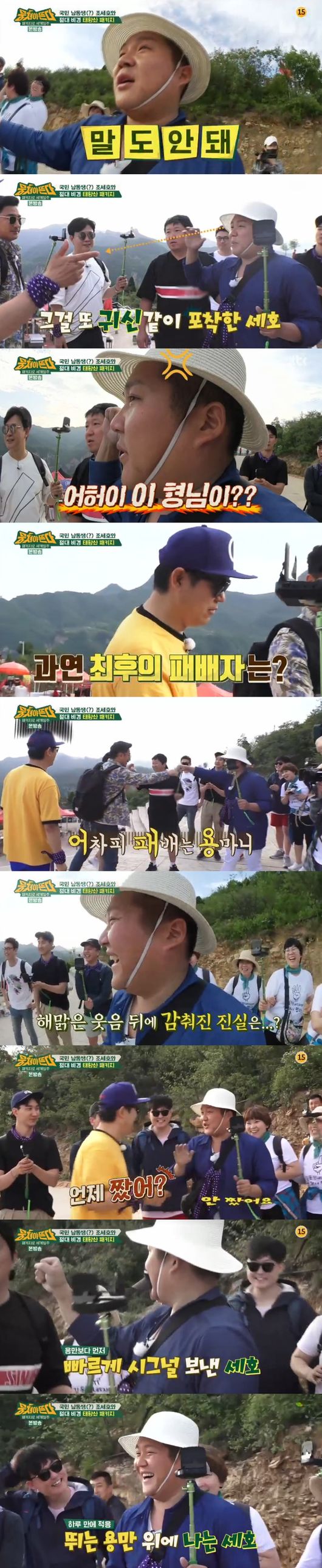 이어 광장에 도착했다. 전원 음료수를 사자는 내기가 시작됐다. 소수 가위바위보로 정하기로 했다. 이때, 김용만이 '가위' 시그널을 보냈다. 이를 포착한 세호는 "이런거 하지말자"며 막았다. 다시 정정당당히 승부를 펼쳤고, 김용만이 당첨됐다. 멤버들은 "세호가 참 빠르다"고 했다. 알고보니 세호가 용만보다 더 먼저 '주먹' 시그널을 보냈던 것이다. 하루만에 적응해 뛰는 용만 위에 나는 세호가 됐다. /ssu0818@osen.co.kr