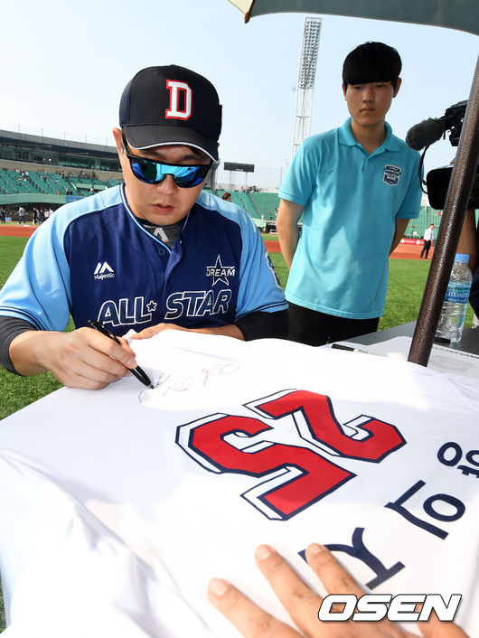 ▲팬들이 준비한 유니폼에 사인하는 양의지