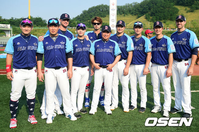 ▲올스타전에 앞서 포즈 취하는 두산 김태형 감독 및 올스타 선수들
