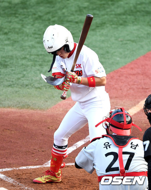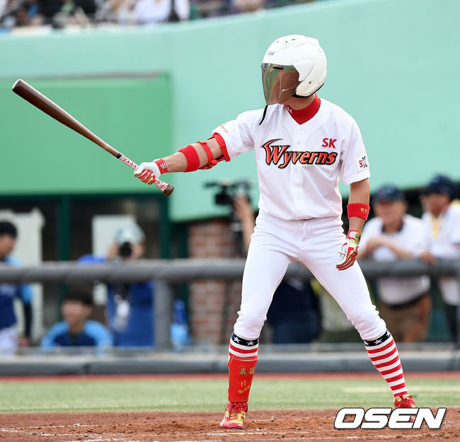 ▲오토바이 헷멧을 쓰고 타석에 들어선 노수광