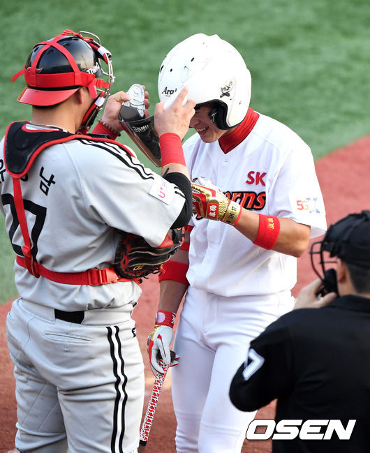 ▲오토바이 헬멧을 쓰고 타석에 들어선 '노토바이' 노수광