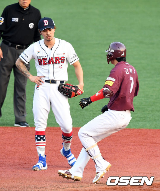 ▲솔로홈런 날린 후 오재원과 세리머니 하는 김하성