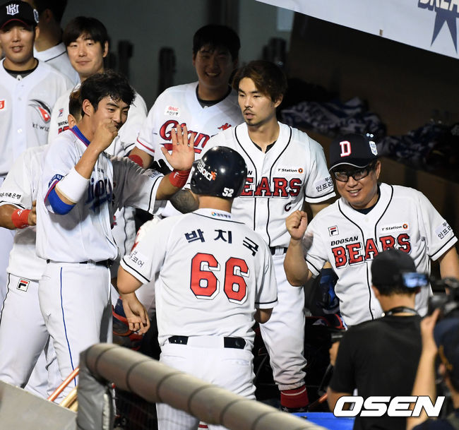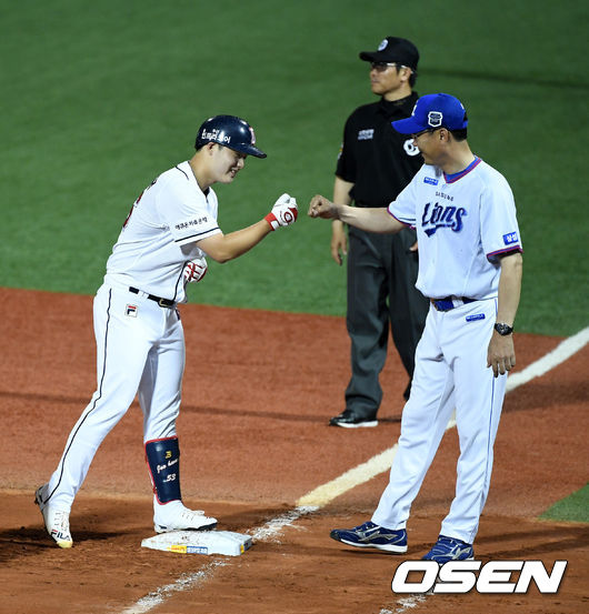 ▲안타 날룬 후 김한수 감독과 기쁨 나누는 박치국