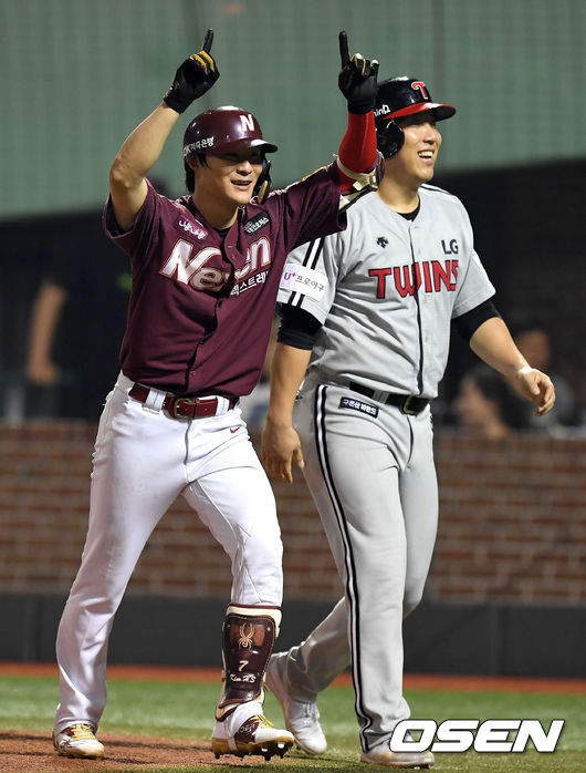 ▲솔로홈런 때린 후 오재원과 장난 치는 김하성