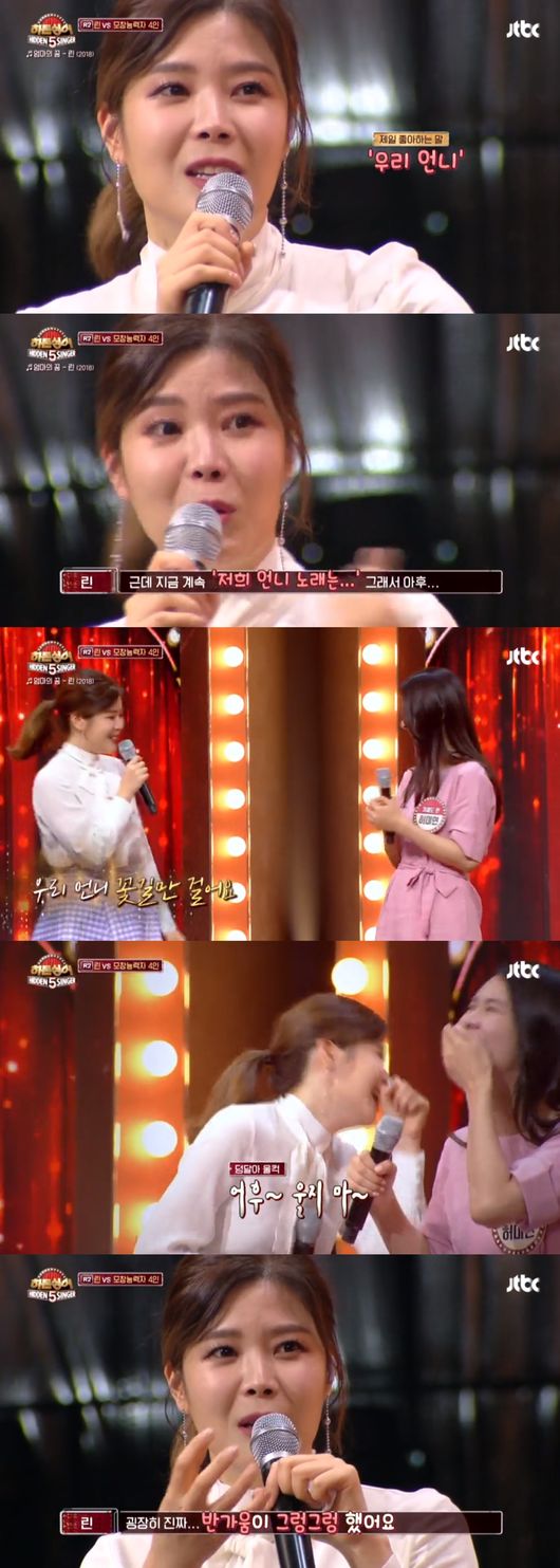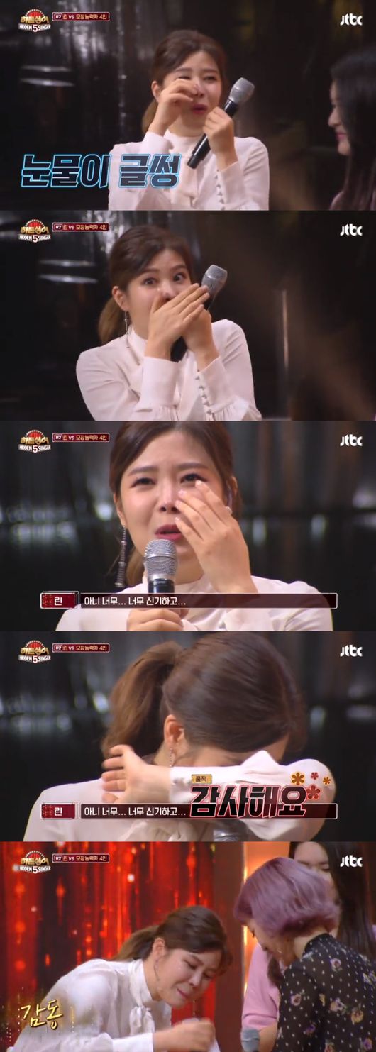 가수 린이 ‘히든싱어5’ 방송 중 여러 번 눈물을 보였다. 모창능력자들을 향한 고마움에 몇 번이고 울었다.