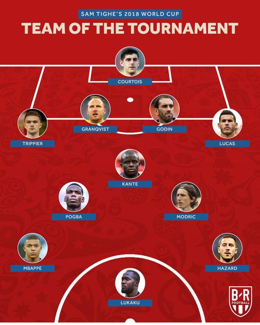 미국 블리처리포트 풋볼은 러시아 월드컵 토너먼트를 빛낸 베스트 일레븐을 선정해 발표했다. 4-3-3 포메이션을 기본으로 스리톱엔 로멜루 루카쿠(벨기에), 킬리안 음바페(프랑스), 에당 아자르(벨기에)가 차지했다. 루카쿠는 FIFA가 뽑은 브론즈 부트(득점 3위), 음바페는 영플레이어상, 아자르는 실버볼을 수상한 바 있다.