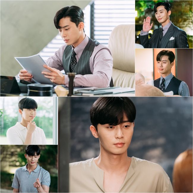 먼저 이영준(박서준 분)은 유명그룹을 이끄는 부회장답게 회사에서는 말끔한 헤어스타일을 고수한다. 재력, 얼굴, 수완까지 모든 것을 다 갖춘 젊은 CEO로, 빈틈 없이 완벽한 모습인 것. 특히 젤로 고정된 깔끔하게 정리한 헤어스타일과 쓰리피스 수트룩으로 세련된 매력을 뿜어내고 있다.