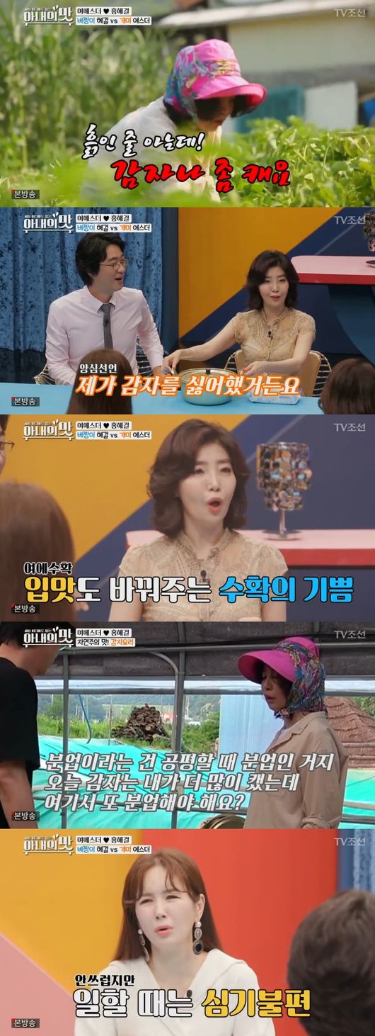 홍혜걸은 힘들어하면서 계속 수다를 떨었다. 그 틈을 타서 휴식을 취하고 있었다. 이를 알아챈 에스더는 "꼼수 부리지말고 감자나 캐라"고 말해 웃음을 안겼다. 그렇게 혼내면서도 할 건 다 하는 모습이 놀라움을 안겼다. 두 사람이 1시간 동안 쉬지 않고 작업하자 감자 2포대 분량이 나왔다. 총 40kg 감자 수확에 성공했다.