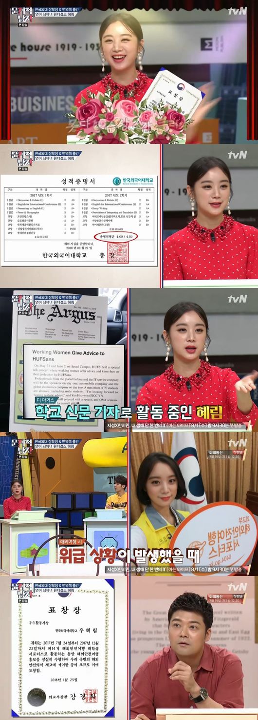 가장 먼저 그녀의 비결은 영자 신문. 혜림은 "영자 신문을 구독하고 매일 어떤 뉴스가 있는지 봤다. 학교가 멀다. 직접 학교 근처 카페에 가서 토익 공부했다. 그 학교 근처에 와 있다는 느낌을 느끼고 싶었다. 기운을 받고 싶었다"고 밝혔다. 또한 4.0의 성적을 받을 수 있었던 비결로는 "한 번 읽고 몇 번 읽고 요약한다. 점점 요약 부분을 줄여간다. 요즘에는 디지털 시대가 돼서 컴퓨터로 할 수 있지만 연필로 쓰는 게 기억에 많이 남는다"고 털어놨다. 이에 박경은 친누나가 같은 학교 같은 학과 출신이라고 말해 눈길을 끌기도 했다.