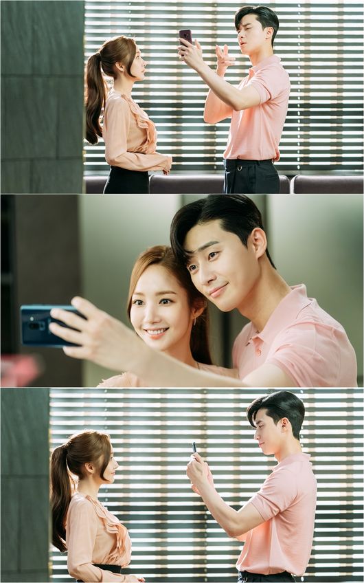 ‘김비서가 왜 그럴까’ 박서준-박민영의 달달함 폭발하는 ‘꿀모닝’이 포착돼 이목을 집중시키고 있다. 커플 셀카 찍기에 푹 빠진 박서준-박민영의 모습이 공개된 것.