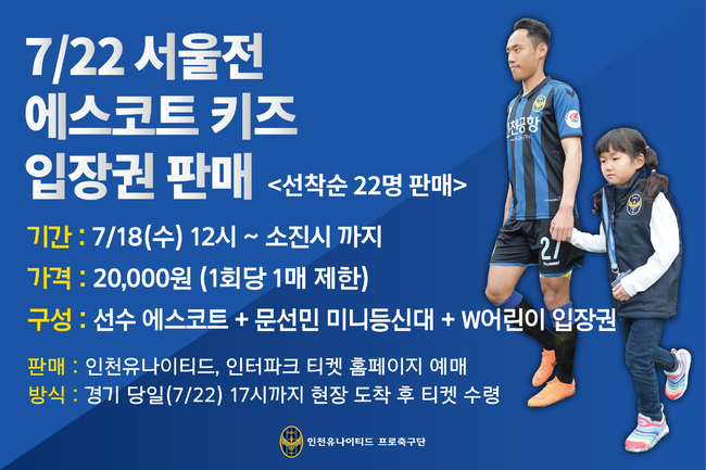 인천유나이티드(대표이사 강인덕)가 오는 22일 FC서울전서 ‘에스코트 키즈 패키지’를 선착순으로 22개만 한정 판매한다.
