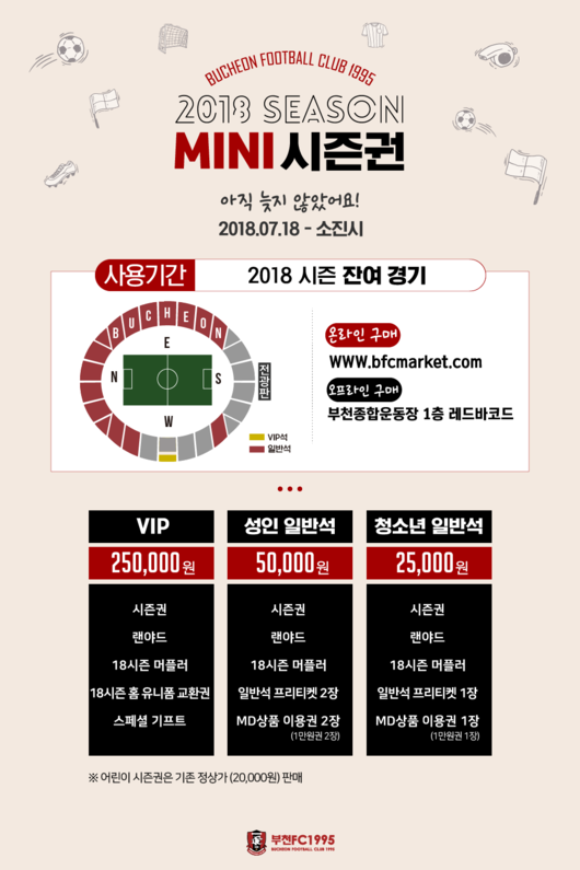 미니 시즌권은 정상가 대비 50% 할인된 가격(어린이권 제외)으로 21일 광주FC와 홈경기부터 잔여 홈 전 경기를 관람할 수 있다. 구단 온라인쇼핑몰과 오프라인매장(레드바코드)에서 구매 할 수 있다. 시즌권 구성품은 기존 제공 품목과 동일하게 구성돼 시즌권을 소장하고 싶었던 부천 팬들에게 좋은 기회가 될 것으로 보인다.