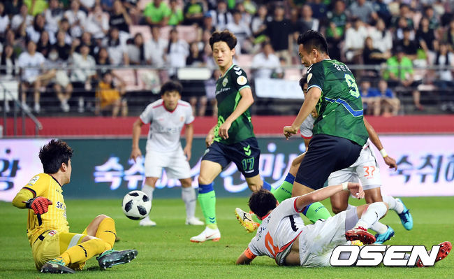 제주도 전반 40분 빠른 역습을 통해 전북 수비를 괴롭혔다. 진성욱이 전북 수비 제치고 송범근과 일대일 상황을 맞이했지만 선방에 막혔다.