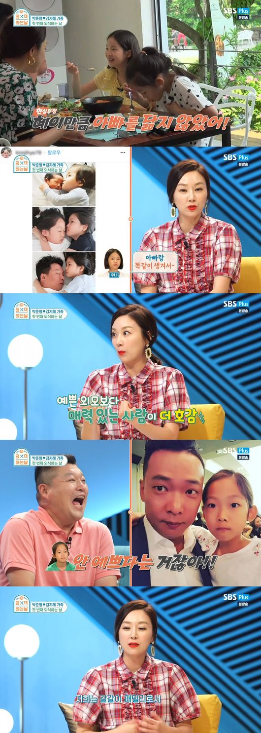 김지혜는 “혜이가 아빠를 많이 닮았다. 첫째는 아빠를 70% 닮았고 둘째는 99.9%를 닮았다”며 “둘째가 학교 들어가서 아빠가 연예인이라고 했더니 담임선생님이 아빠가 박준형이냐고 했다. 그 정도로 닮았다”고 해 모두가 웃었다.
