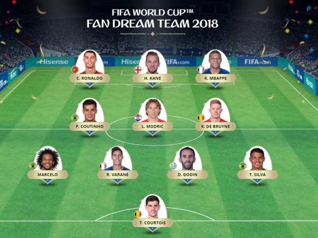 국제축구연맹(FIFA)은 2018 러시아 월드컵 팬 선정 드림팀을 공개했다. 총 129,060명이 참가해 최고 활약을 펼친 11명을 뽑았다.