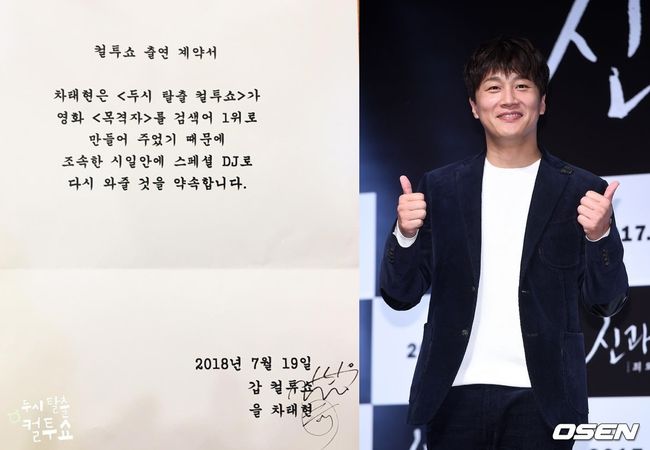 계약서에는 "차태현은 '두시 탈출 컬투쇼'가 영화 '목격자'를 검색어 1위로 만들어줬기 때문에 조속한 시일 안에 스페셜 DJ로 다시 와줄 것을 약속합니다"라고 적혀 있다. 컬투쇼 측은 갑으로 사인을 마쳤고, 차태현은 계약서의 을로 사인을 해 웃음을 자아냈다.