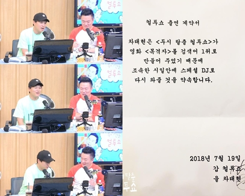 계약서에는 "차태현은 '두시탈출 컬투쇼'가 영화 '목격자'를 검색어 1위로 만들어줬기 때문에 조속한 시일 안에 스페셜 DJ로 다시 와줄 것을 약속합니다"라고 적혀 있다. 컬투쇼 측은 갑으로 사인을 마쳤고, 차태현은 계약서의 을로 사인을 해 웃음을 자아냈다. 8월 내 차태현의 재출연이 기대를 모으는 이유다.