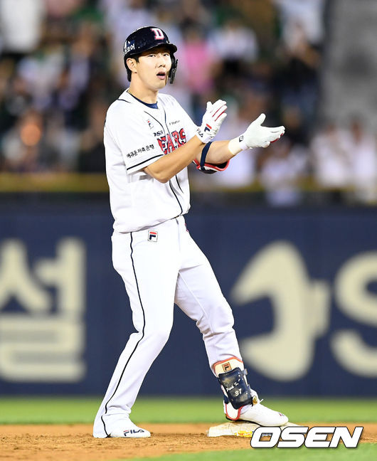 경기를 마친 뒤 박건우는 "최근에 타격 밸런스는 괜찮다. 내가 살아나간 다음에 팀 득점으로 이어진 부분이 가장 만족스럽다"라고 소감을 밝혔다. 이어서 "수비 코치님이 수비 위치를 알려준대로 옮겼고, 잡아야겠다고 집중한 덕분에 잡을 수 있었다"고 고마움을 전했다./ bellstop@osen.co.kr