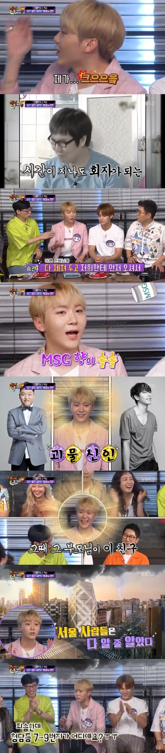 민규는 "연습생들끼리는 새 연습생이 들어오면 소문이 난다. 그때 얼굴은 싸이를 닮았는데, 노래는 박효신인 괴물 연습생이 들어온다고 해서 다들 긴장했다. 근데 부모님만 오시고 안 오더라. 알고보니 그 부모님이 승관이었다. 당시 흰색 티셔츠에 핑크색 반바지를 입었었다"며 지금과 사뭇 달랐던 비주얼을 언급해 주변을 폭소케 했다.