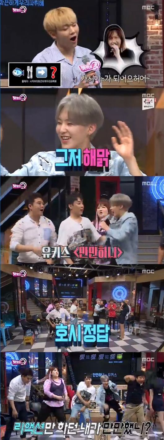 호시는 노래를 잘 몰라 졸지에 리액션 킹이 됐다. 그런 호시를 위해 이수근 팀은 호시가 마치 정답을 맞힌 것처럼 상황을 꾸며주기도. 호시는 "민규한테 '너 활약 못했더라' 이랬는데 나한테 '너도 그럴 거야'라고 하더라"고 고백해 웃음을 자아냈다. 하지만 막판에 호시가 '만만하니' 노래를 맞혀 환호했고, 유세윤은 "내가 호시와 함께 나갔는데 호시의 간절함이 느껴졌다. 내가 마이크를 놓쳤는데도 기뻤다"고 함께 좋아했다.