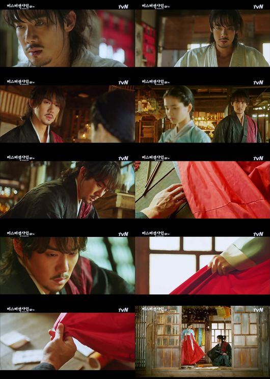 그때, 애신의 치맛자락이 동매의 손끝에 닿을 듯 말 듯 했다. 동매는 그대로 멈춰 쓸쓸해진 눈빛으로 손끝을 바라보았다. 시청자들을 숨죽이게 하는 순간이었다. 동매의 손끝에 치맛자락이 닿자, 애신은 놀라 급히 자신의 치맛자락을 잡아당겼고 동매 역시 치맛자락의 끝을 잡았다. 애신이 무슨 짓이냐 묻자, 서늘해진 눈빛의 동매는 “아무것도요. 그저... 있습니다. 애기씨”라고 말했다.