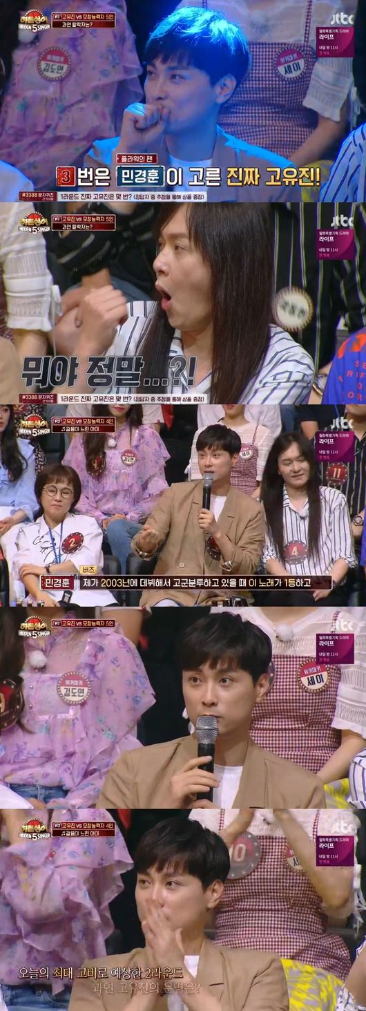 마의 2라운드를 통고할 수 있을지 최대 고비로 예상했던 2라운드가 시작됐다. 판정단들은 쉽사리 버튼을 누르지 못했다. 민경훈 역시 "헷갈린다"면서 2번을 선택했다고 했다. 목소리가 성량이 제일 작다고 자신만의 힌트를 전했다. 플라워 멤버들 역시 "밴드 곡이 아니라서 어렵다"며 헷갈려했다. 김정민은 5번에 고유진이 있음을 확신했다. 만약 아니라면 집에 보내달라며 비장한 모습을 보였다. 그 정도로 힘있고 부드럽고 감미로운 고유진을 표현했다고 이유를 전했다.