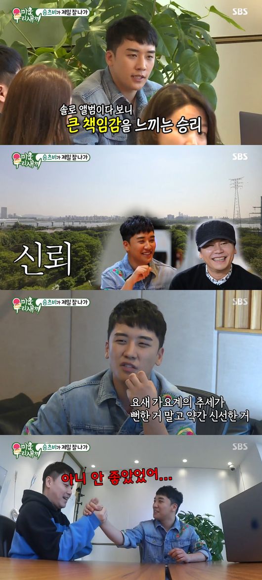 22일 오후 방송된 SBS 예능 ‘미운 우리 새끼’에서 5년 만에 솔로앨범을 발매하는 승리의 일상이 그려졌다.