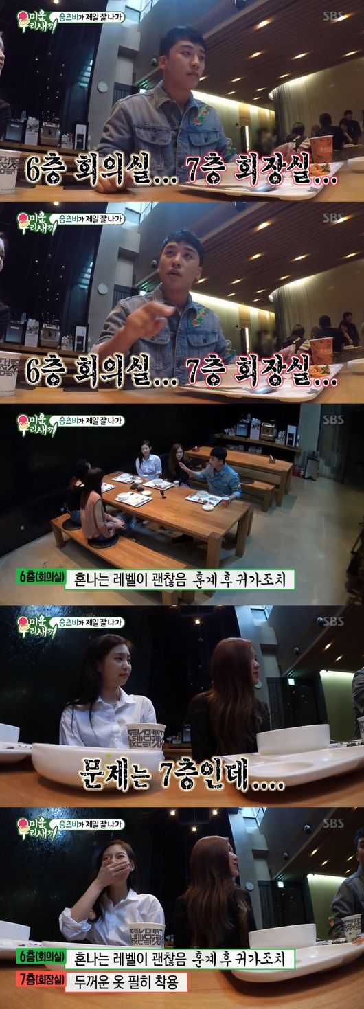 그러면서 승리는 “열애설이나 루머에 휩싸여 (회사나 주변 사람들로부터)문자 320개를 받으면, 보기 전에 먼저 찬물을 마셔야 한다. 보면서 목이 타기 때문”이라고 말해 웃음을 안겼다. 그러면서 “내가 회사 6층과 7층에 자주 불려 갔었다. 양현석 회장님을 만날 땐 먼저 칭찬을 하라”고 덧붙였다.