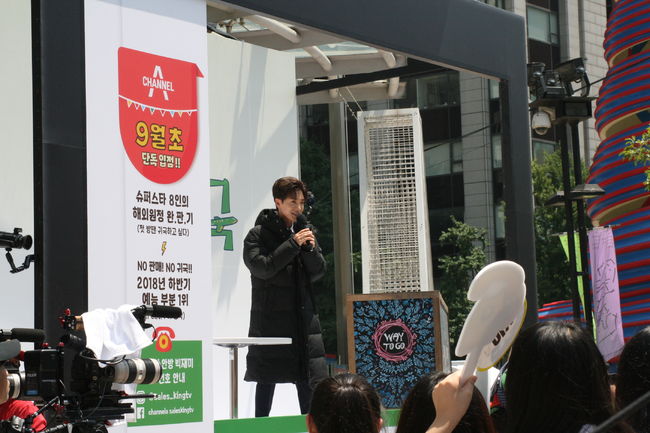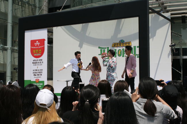 각 팀 멤버들은 ‘미스터리 박스’ 에서 랜덤으로 물건을 골라 5분 간 재치 넘치는 즉흥 홍보를 진행했으며 100명의 평가단은 들고 있는 팻말을 들어 멤버들의 완판 성공을 결정했다. 이날 폭염 속 에도 불구하고 동아광장 앞을 가득 메운 100명의 평가단은 날씨보다 더 뜨거운 열정으로 8명의 멤버들 하나하나의 완판 능력을 평가했다.