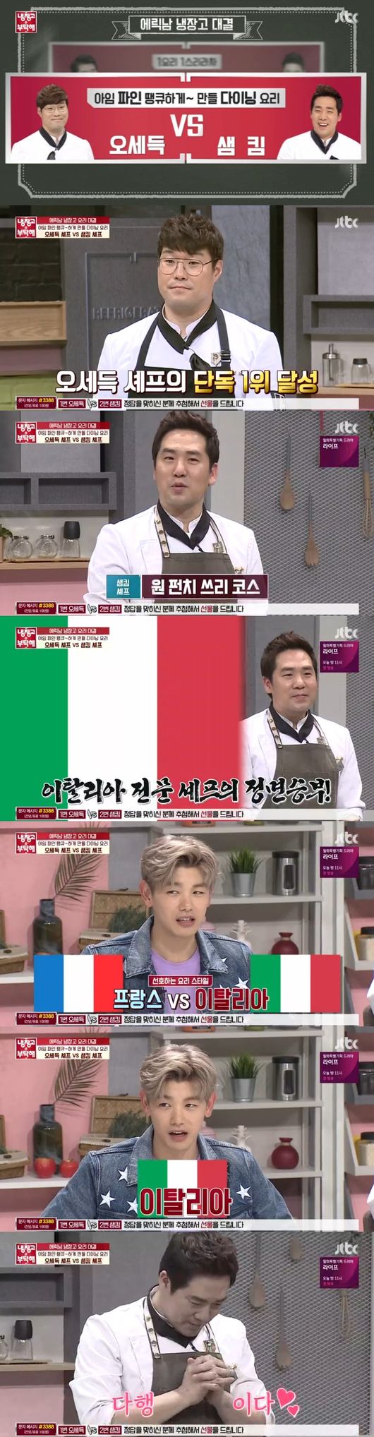 샘킴은 '원펀치 쓰리코스'란 요리제목으로 이탈리아 요리로 승부를 던졌다. 이탈리아식 세가지 요리 코스를 보여줄 것이라 했다. 누가 단독 1위를 차지하며 1위 명예를 지킬 것인지, 요리대결이 시작됐다. 프랑스 대 이탈리아 대항전이 된 듯 팽팽한 긴장감이 감돌았다.