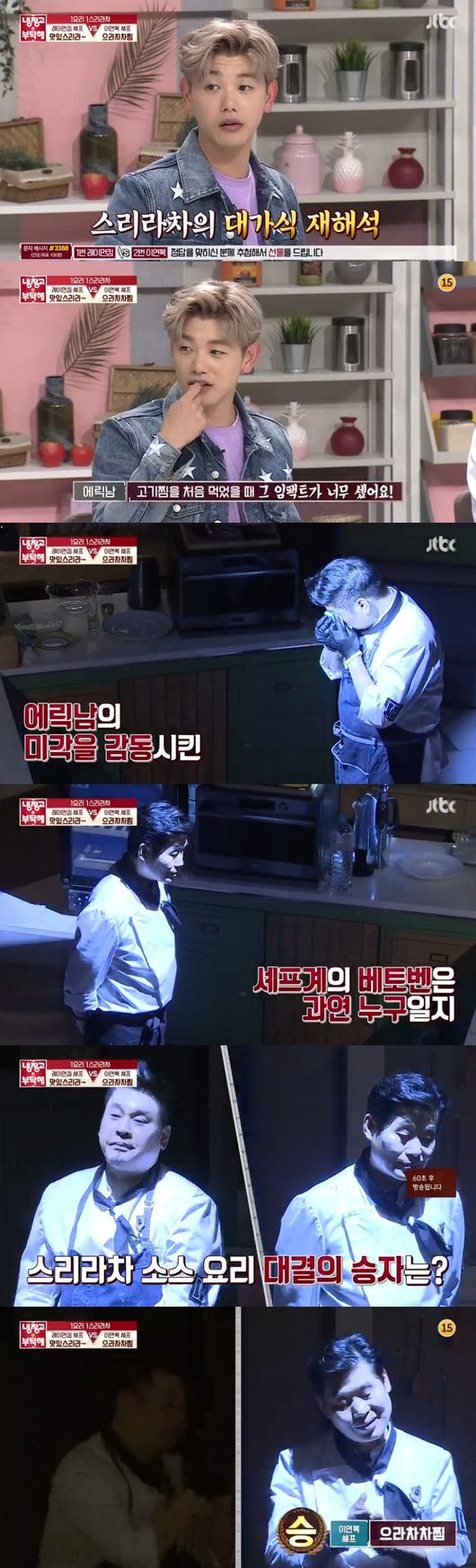 이를 위해 먼저 이연복과 레이먼킴이 첫번째 대결을 펼쳤다. 레이먼킴은 '맛있스리라'란 요리명을 전하면서 치킨 프라이드 스테이크를 할 것이라 했다. 새우 넣은 소고기 스테이크에 스리라차 소스를 곁드린 요리를 전할 것이라 했다.또한 스리라차를 넣은 매운 칵테일을 만들 것이라고 해 솔깃하게 했다. 이연복은 '으라차차찜'이란 요리명으로, 스리라차 소스를 넣은 소고기 찜과 가자튀김을 만들 것이라 했다.