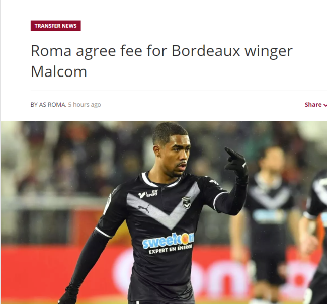 로마와 보르도는 지난 23일(한국시간) 홈페이지와 SNS 등 공식 채널을 통해 말콤의 이적을 공식적으로 발표했다.