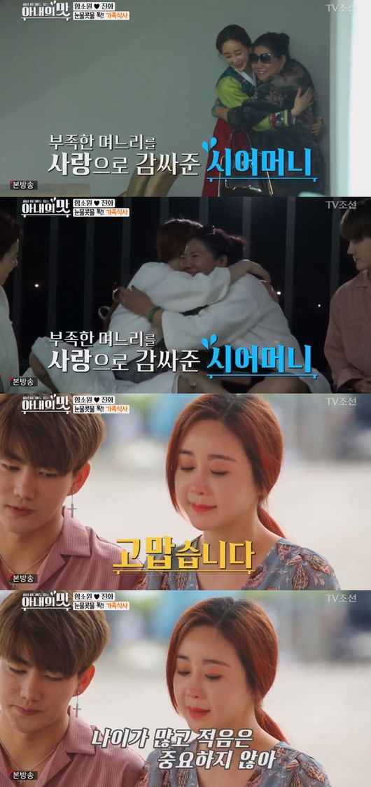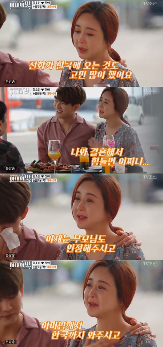 함소원은 지난 24일 방송된 TV조선 예능 프로그램 '세상 어디에도 없는, 아내의 맛'(이하 '아내의 맛') 8회에서 남편 진화, 시어머니, 시누이와 식사를 하던 중 눈물을 쏟았다.