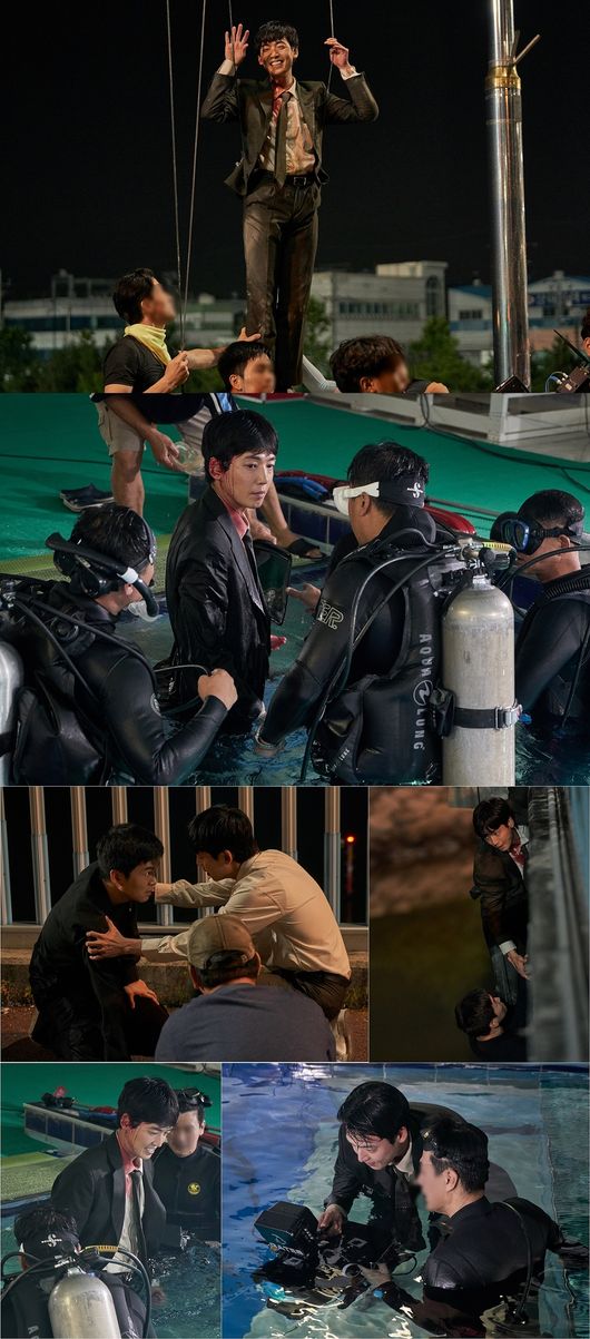 고난도의 촬영에서도 흔들리지 않는 정경호의 열연은 현장 분위기를 한층 끌어올렸다. 와이어에 매달리고도 환한 웃음을 보내는가 하면, 수중 촬영에서도 완벽한 장면을 위해 꼼꼼한 모니터를 이어가며 투혼을 발휘했다. 서사의 변곡점이 될 수 있는 중요한 장면이었던 만큼 이정효 감독은 촬영 직전까지 정경호와 아이디어를 교환하며 세밀한 디렉팅으로 촬영장을 이끌었다는 후문. 이제는 눈빛만 봐도 통하는 정경호와 이정효 감독의 시너지는 잊을 수 없는 명품 엔딩을 선사했다.