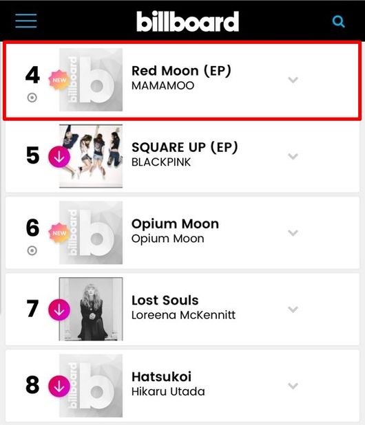 미국 빌보드에 따르면 25일 마마무의 일곱 번째 미니앨범 '레드 문(Red Moon)'이 월드 앨범차트에서 4위를 차지했다.