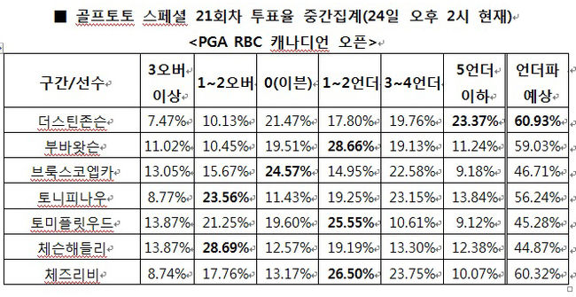 체육진흥투표권 수탁사업자인 ㈜케이토토(www.ktoto.co.kr)는 오는 26일(목)에 온타리오(캐나다)에서 열리는 ‘PGA RBC 캐나디언 오픈’을 대상으로 한 골프토토 스페셜 21회차에서 전체 참가자의 60.93%가 1번 선수 더스틴 존슨의 언더파 활약을 예상했다고 밝혔다.