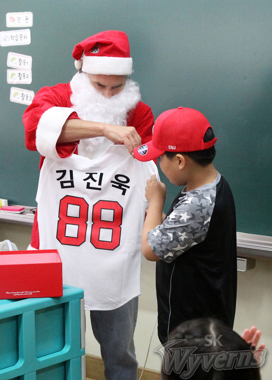 이벤트 예정 시간인 오전 10시보다 20분 먼저 학교에 도착한 힐만 감독은 대기실에서 산타클로스 복장으로 환복한 후 선물 주머니와 함께 김진욱 어린이가 있는 교실로 향했다.