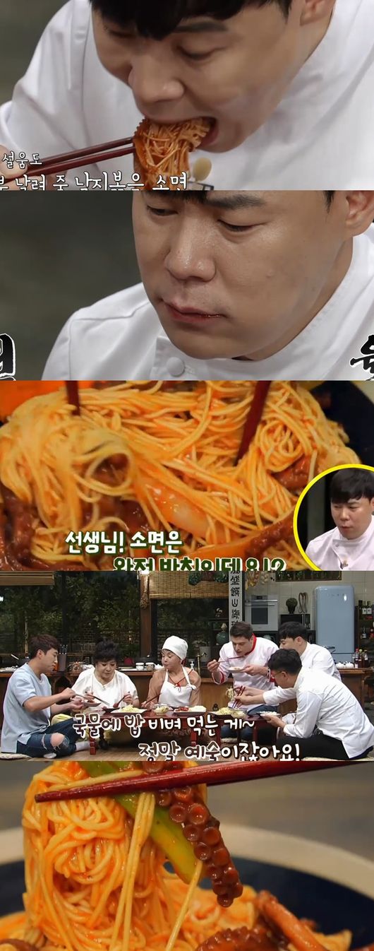 낙지볶음이 완성될 쯤엔 소면을 삶으라고 했다. 미카엘이 여유있게 김수미의 레시피를 따라했다. 그에 반해 최현석은 "재료도 안보여. 자리가"라며 힘들어했다.