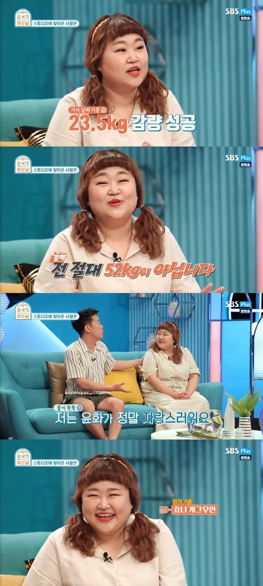 홍윤화는 25일 방송된 SBS플러스 '외식하는 날'에서 "갑자기 검색어 1위에 올라서 내가 뭘 잘못했나 했다"며 "그런데 알고 보니 그날 기준으로 23.5kg을 뺐더라. 사랑도 얻고 날씬한 몸도 얻었다고 했다"고 했다.