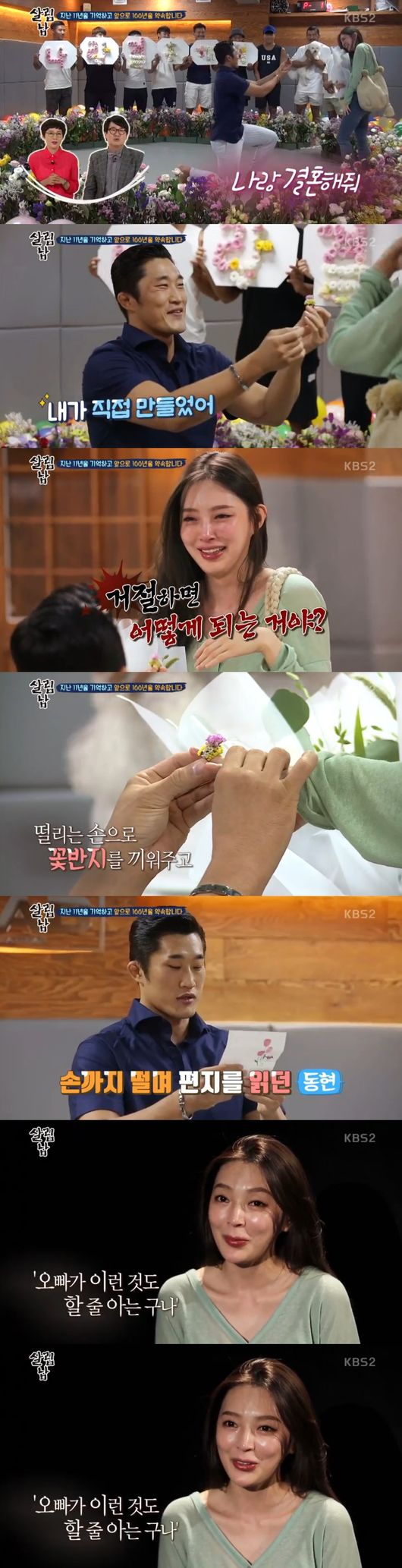 동현은 "부족하겠지만 최선을 다한 남자가 되고, 최고의 아빠가 될 자신있다. 사랑한다"면서 직접 만든 꽃반지를 떨리는 손으로 껴주며 입맞춤했다. 하율은 "손까지 떨며 편지 읽는 모습 감동 많이 받았다. 오빠가 이런것도 할줄 아는구나 싶었다"며 감동의 눈물을 흘렸다.