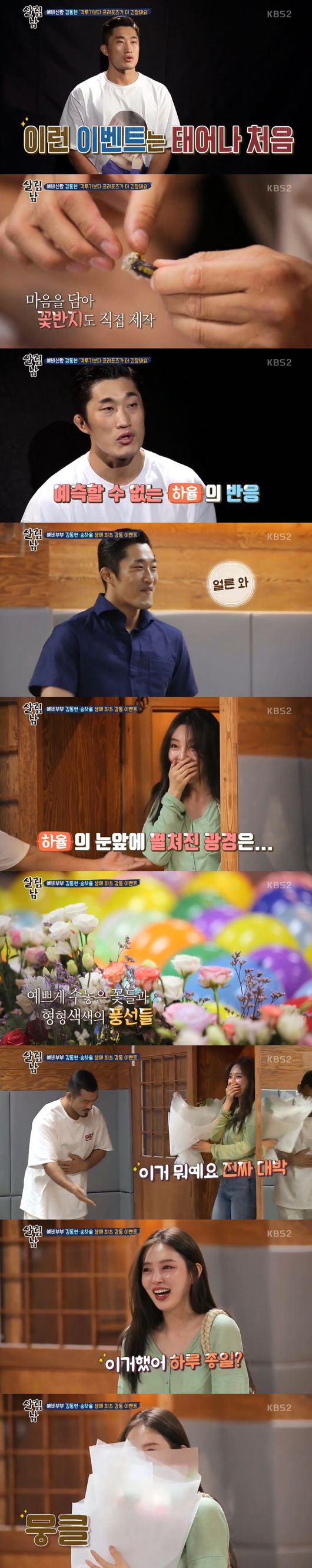 김동현은 "태어나 처음 해보는 이벤트, 어떤 표정을 지을지 모르겠다"면서 마음을 담아 꽃반지도 직접 제작했다. 이종격투기 경기장이 꽃밭이 되었다. 드디어 운명의 시간이 다가왔다. 예비신부 하율은 도착하자마자 꽃들을 보며 화들짝 놀랐다. 하루종일 이벤트를 준비한 동현을 보며 눈시울을 붉혔다.