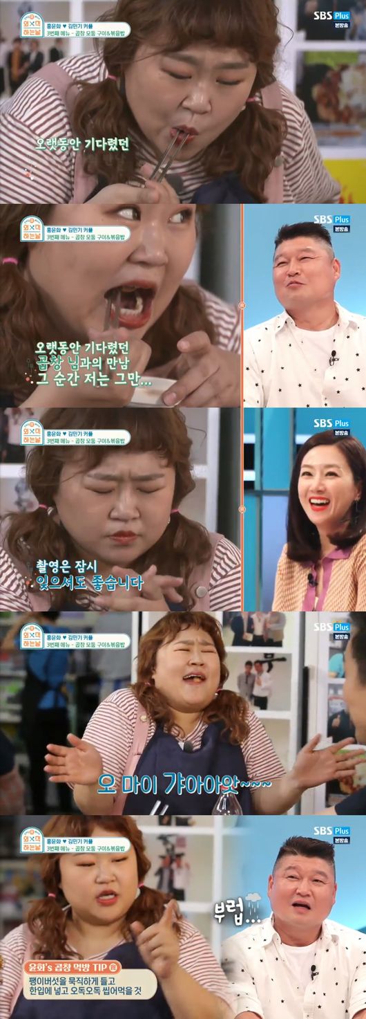 그리고는 떡과 곱창을 젓가락에 끼워 ‘곱떡곱떡’을 만들어 홍윤화에게 줬고 홍윤화는 맛깔나게 곱떡곱떡을 먹어 시청자들의 침샘을 자극했다.