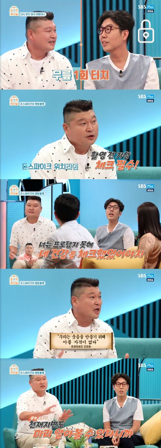 이에 강호동은 진지한 얼굴을 하고는 “프로답지 못한 행동이다. 돈스파이크 위치면 기상을 체크했어야 했다”고 하자 김영철은 “‘아는 형님’ 촬영할 때 이수근이 감기가 심하게 걸린 적이 있었는데 이수근한테 ‘넌 프로답지 못해. 건강을 체크했어야지’라고 했다”고 폭로했다.