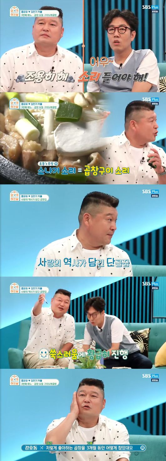 이뿐 아니라 강호동은 홍윤화의 곱창 먹방을 보고 괴로워했다. 김영철이 곱창 굽는 소리에 “소리 좋다”고 하자 강호동은 “조용히 해. 소리 들어야 한다”고 말해 모두를 폭소케 했다. 그러면서 “여름에 소나기 내리는 소리하고 똑같지 않냐”며 감탄했다.